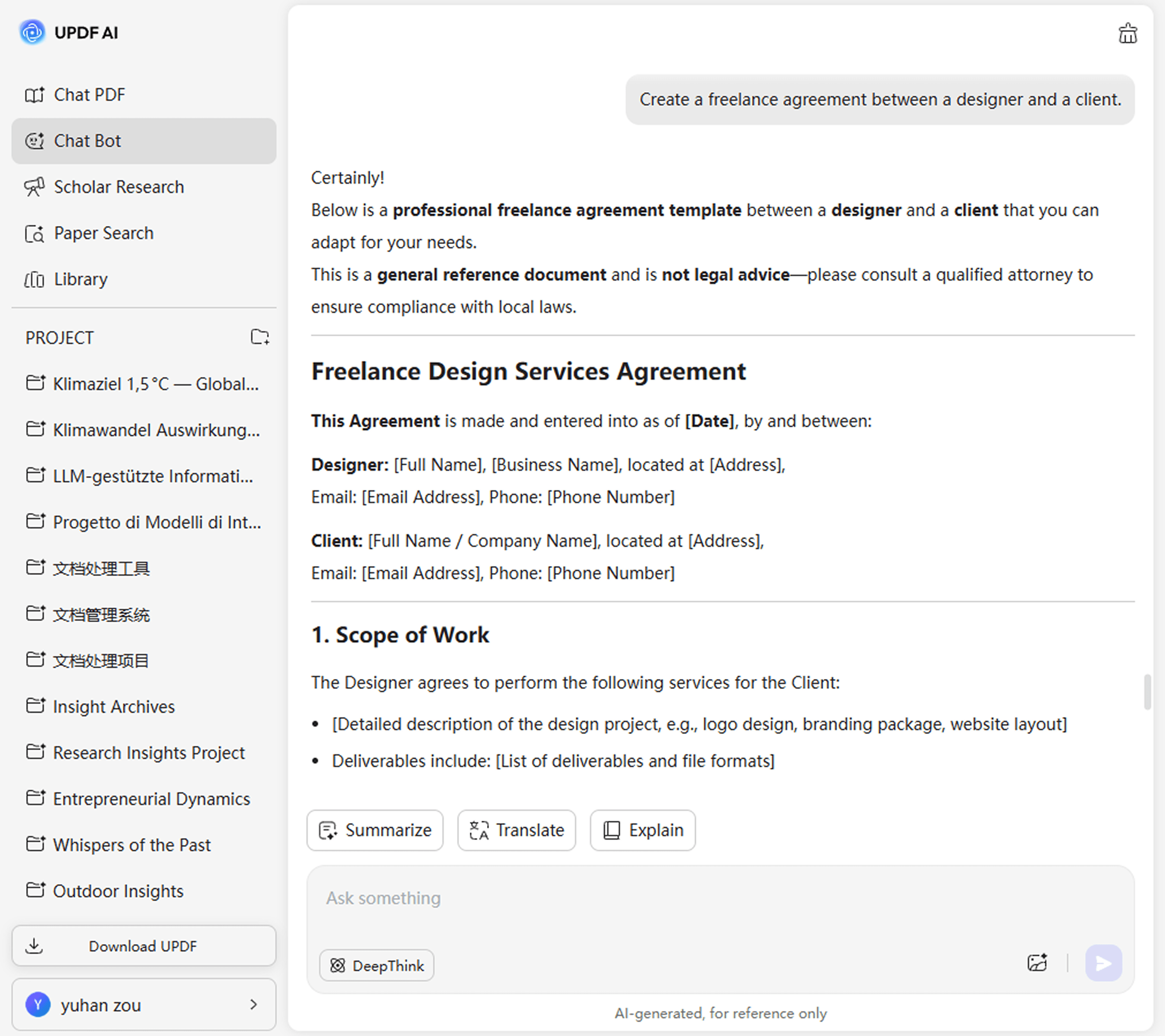 Create contracts you can rely on. UPDF AI ensures precise, polished, and ready-to-use agreements for freelancers, small businesses, and HR teams alike.