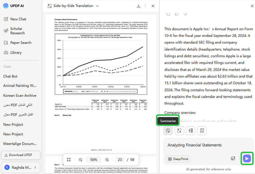 • Get Results Instantly: Enter “Analyzing Financial Statements” or request a summary report, and UPDF AI will generate clear, actionable insights in seconds.