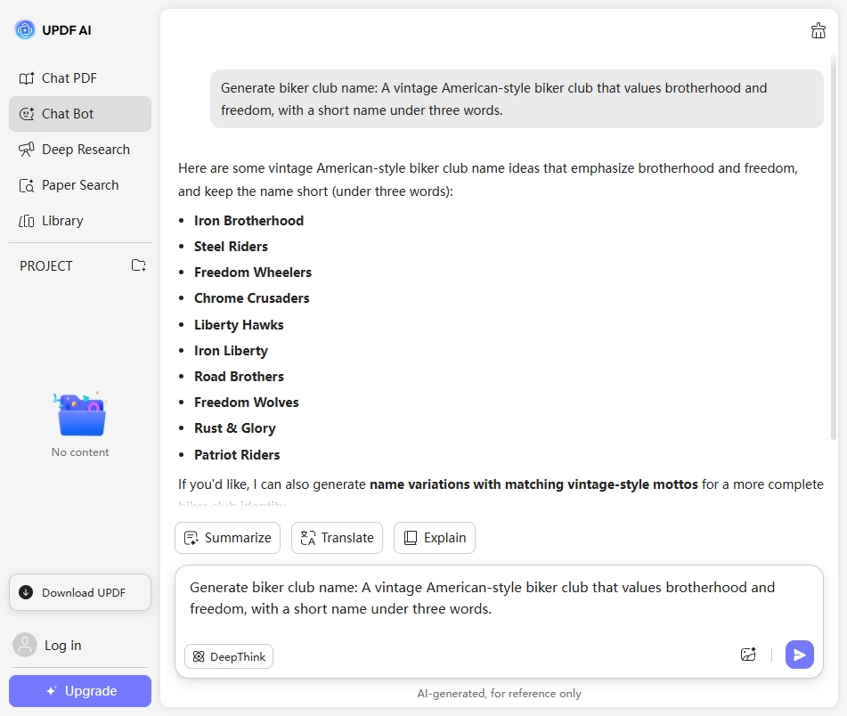 With both ChatGPT-5 and DeepSeek R1 built in, UPDF AI Biker Club Name Generator creates rich, customized, and creative naming options that truly reflect your club’s culture and attitude.