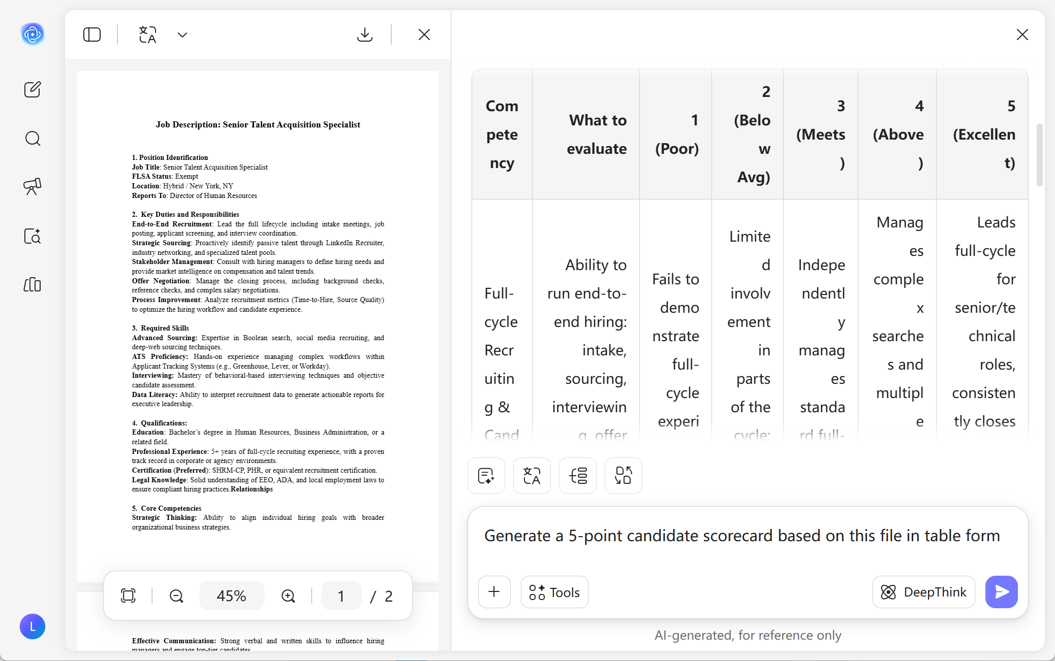 Ask UPDF AI to: "Generate a 5-point candidate scorecard for this role based on this file in table form." You can instantly refine the scoring criteria to match your team’s specific hiring standards.