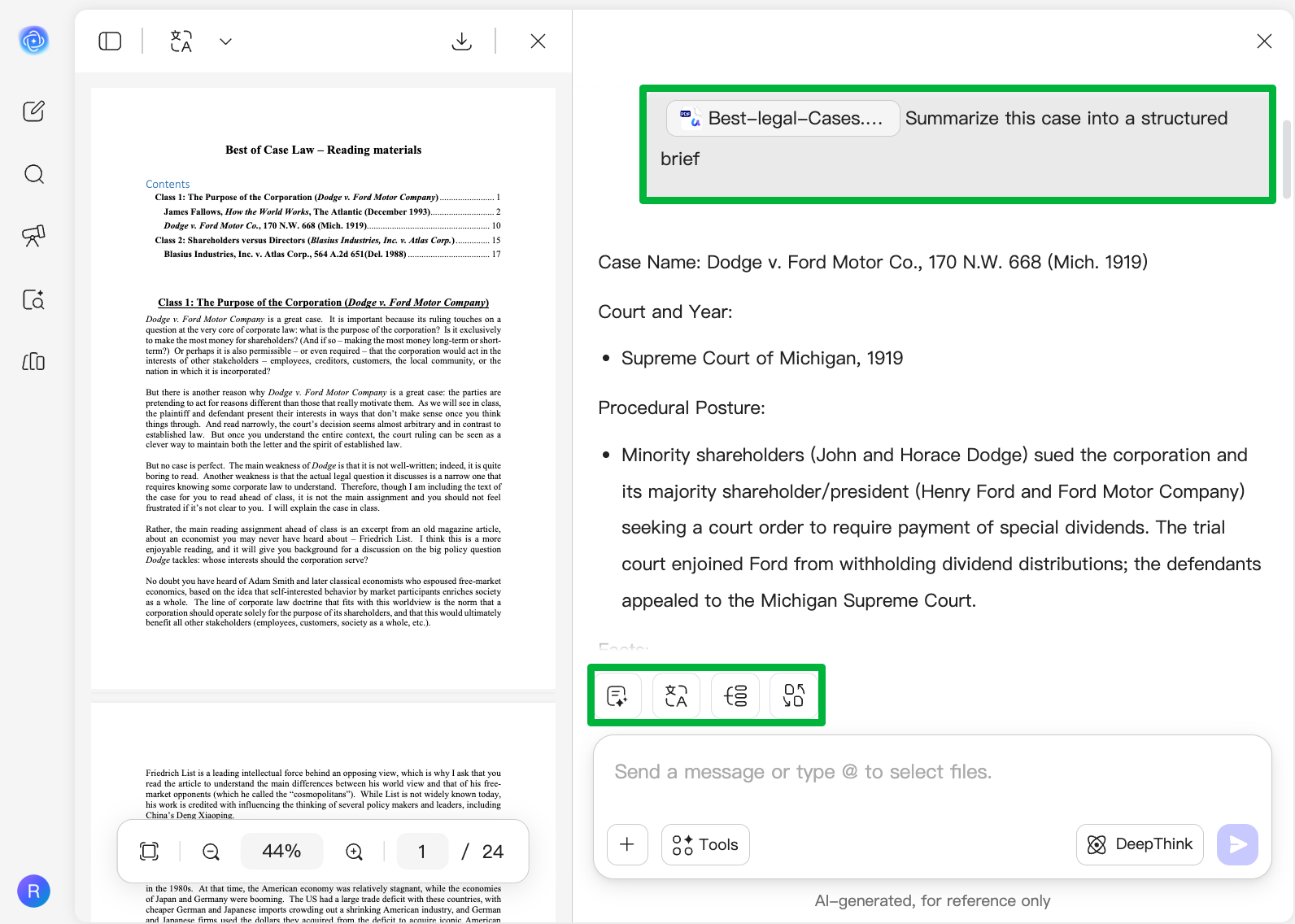 Send a simple prompt like “Summarize this case into a structured brief” or “Identify facts, issues, and rulings.” UPDF AI will instantly break down the case into clear, organized sections.
