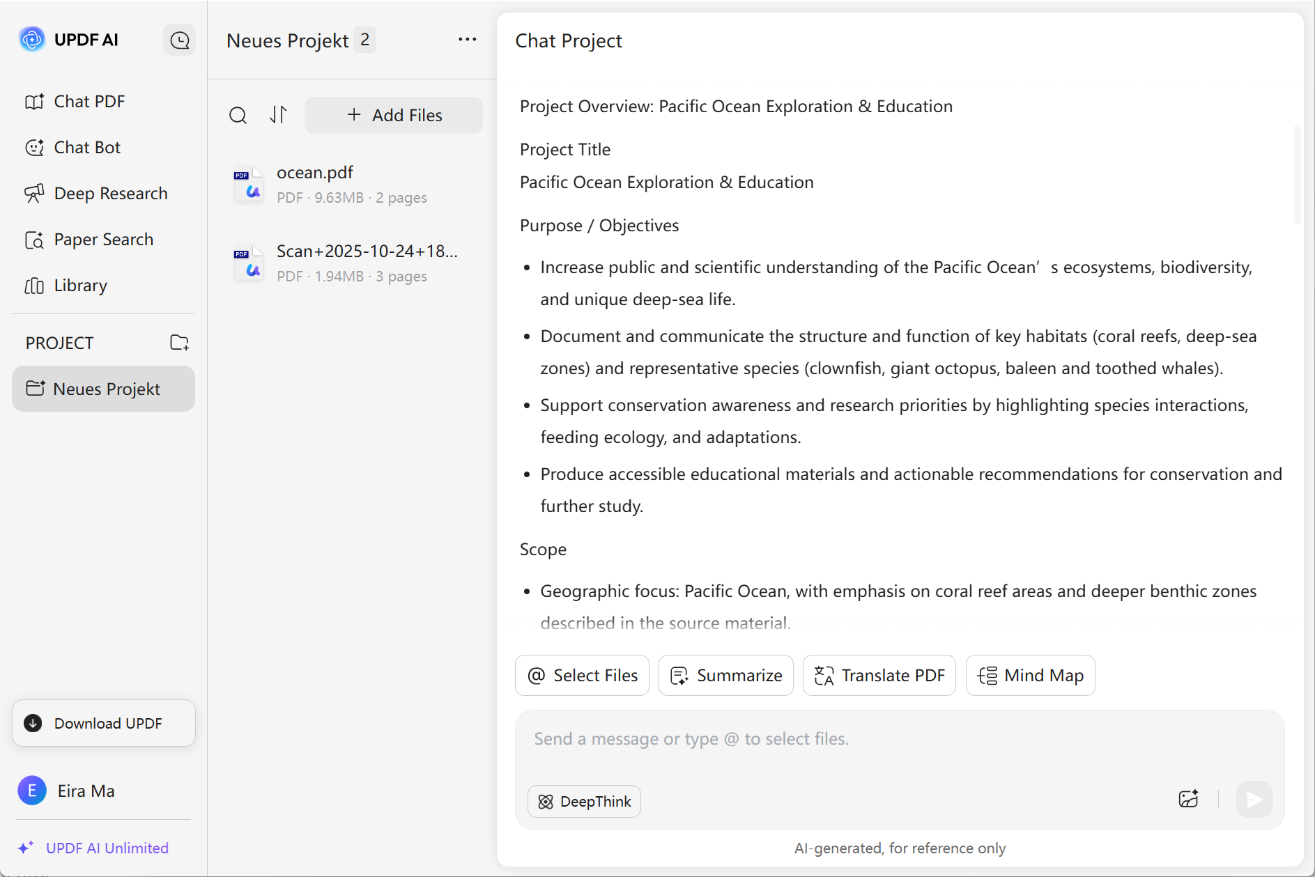 UPDF AI will then instantly analyzes all uploaded PDFs, extracts key insights, and auto-generates a structured Project Overview.