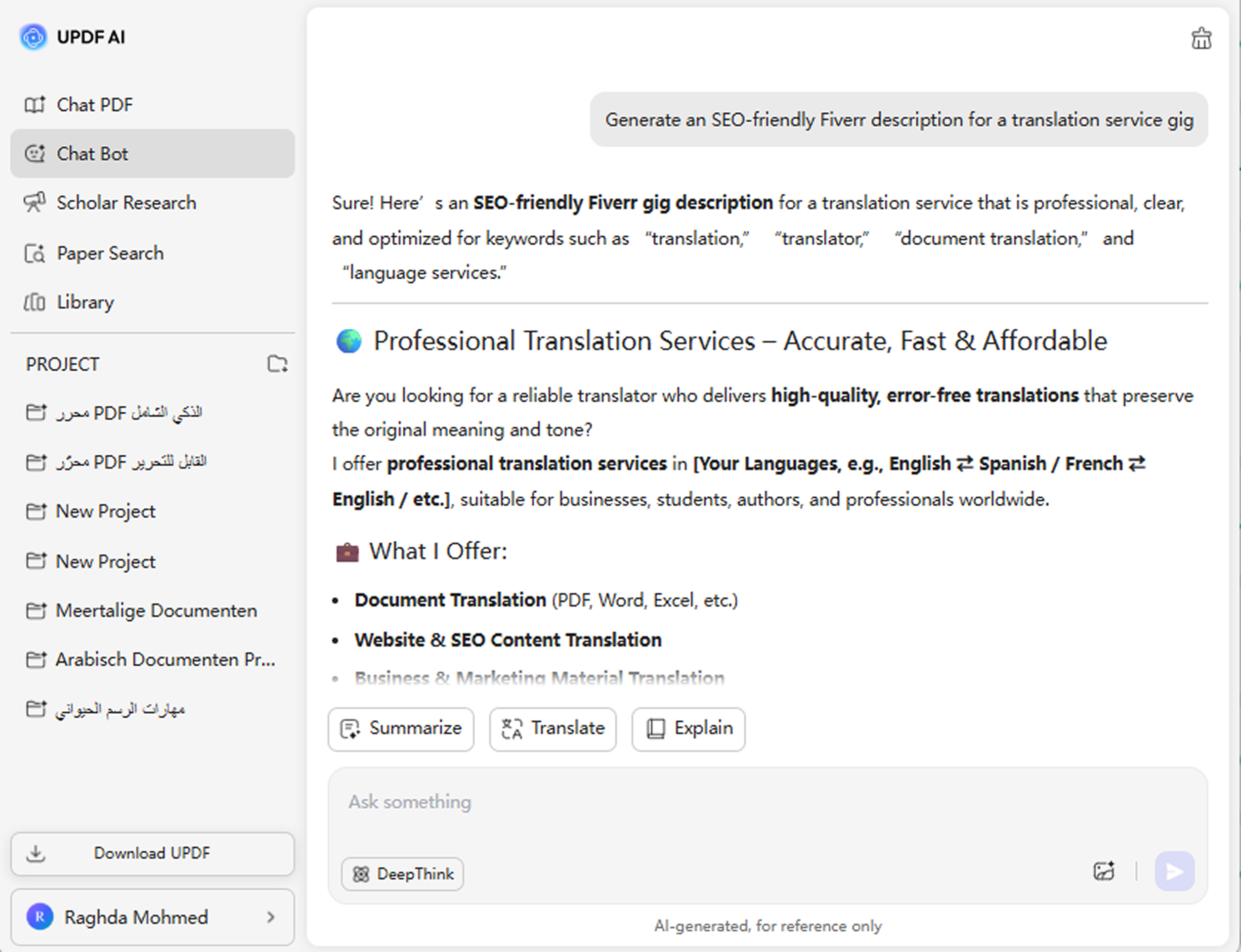Type what kind of Fiverr description you need — include your gig category, target audience, tone, and style preference. For example: “Generate an SEO-friendly Fiverr description for a translation service gig.” You can also upload your existing description, and UPDF AI will refine and optimize it to attract more clients and improve search visibility.