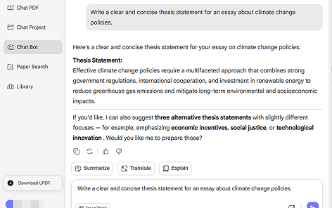 UPDF AI helps you structure ideas, generate clearer thesis statements, and improve the overall quality of academic writing.