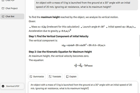 UPDF AI helps break down physics questions step by step, making it easier to understand formulas, calculations, and problem-solving logic.