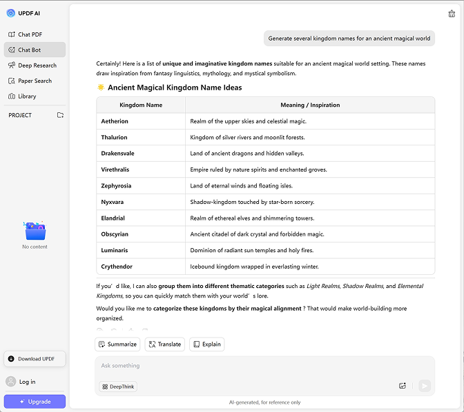 Whether you’re a writer, game developer, filmmaker, or DnD world-builder, UPDF AI makes it easy to craft names for kingdoms, empires, and magical realms that feel authentic, inspiring, and perfectly aligned with your creative vision.