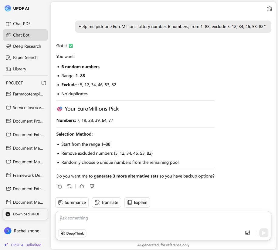 UPDF AI lets you try its features for free with 100 prompts. No sign-up is required for these first 100 uses, allowing you to effortlessly generate lottery numbers and explore AI-powered PDF tools without any commitment.