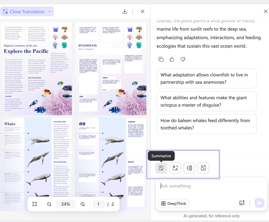 Summarize: For dense reports or academic papers, UPDF AI gives you instant clarity. Upload the PDF to receive an automatic, structured summary. You can summarize selected pages, the entire file with one click, or paste text for a custom summary—perfect for faster, easier reading.