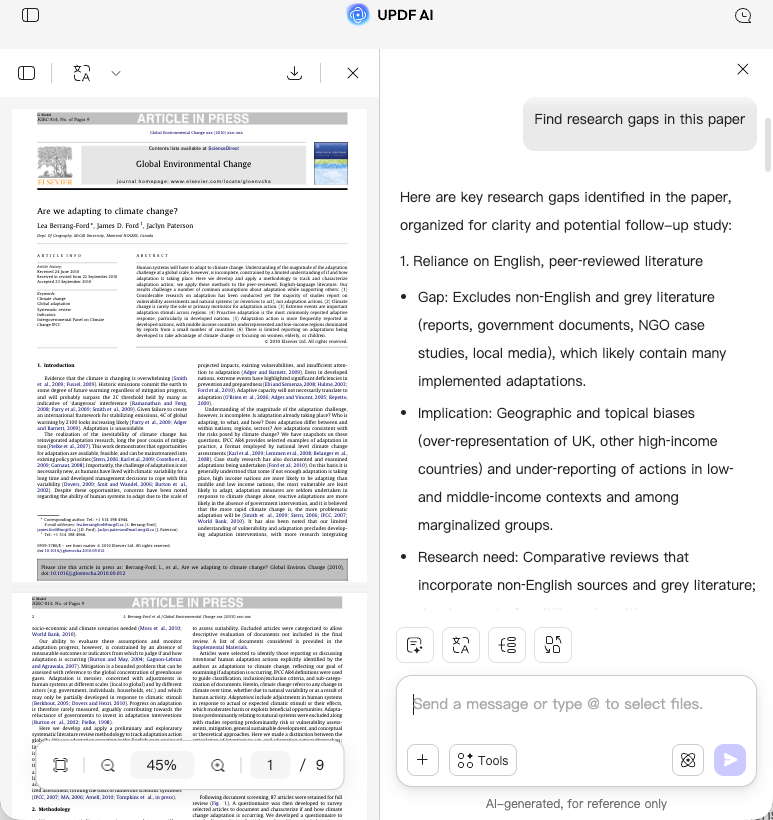 Click “Send,” and UPDF AI will generate gap summaries, research opportunities or suggested directions instantly. You can ask follow-up questions to refine your idea further.