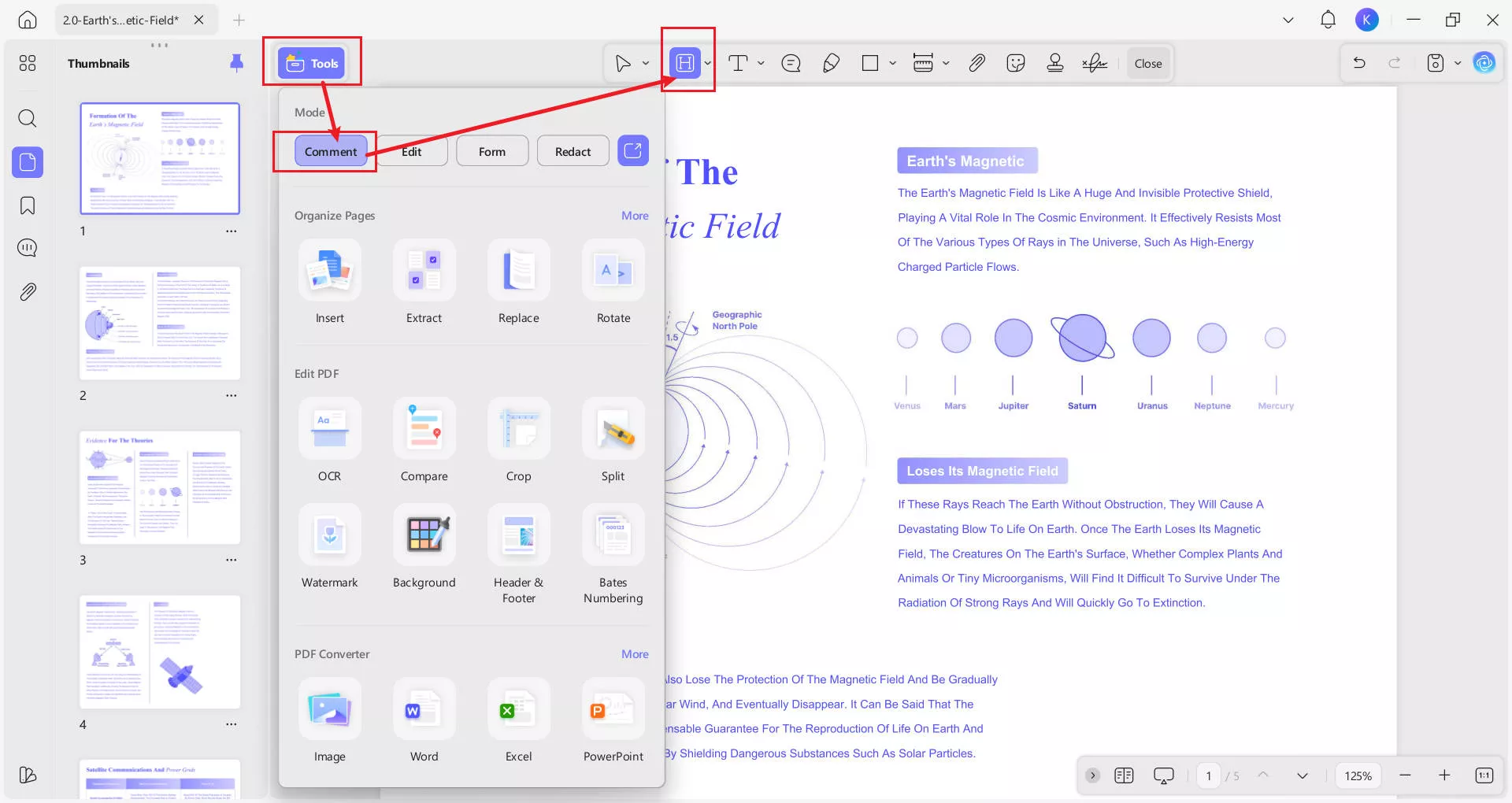 Now, Click "Comment" from the "Tools" menu pane and click the "Highlight” option from the top menu. You may also pick your preferred color from the pallet appearing when you click “Highlight”.