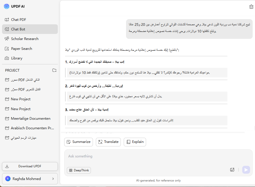 هؤلاء المستخدمون يحتاجون إلى كتابة إعلانات لعملاء مختلفين يوميًا. يقدم UPDF AI أنماطًا متعددة للنسخ الإعلانية — مثل الإقناعي، الفكاهي، والمعلوماتي — مما يسمح لهم بتجربة نسخ مختلفة بسهولة وتحسين معدلات التحويل.