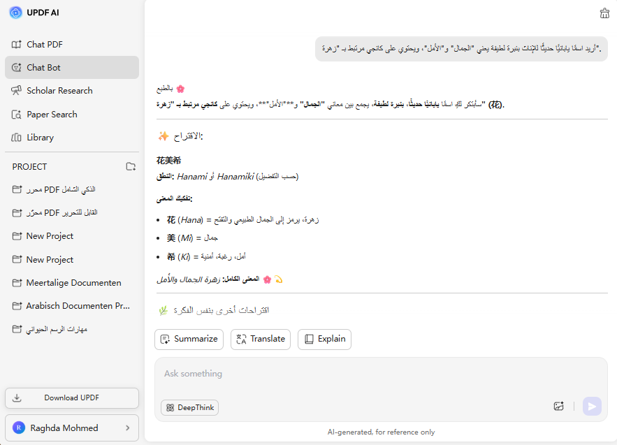 توقف عن إضاعة الوقت في البحث أو التفكير. يمكن لمولد أسماء UPDF AI اليابانية إنشاء مجموعة من الأسماء التي تتوافق مع المعاني والمواضيع المفضلة لديك، مما يساعدك على العثور على الاسم المثالي بسرعة أكبر.