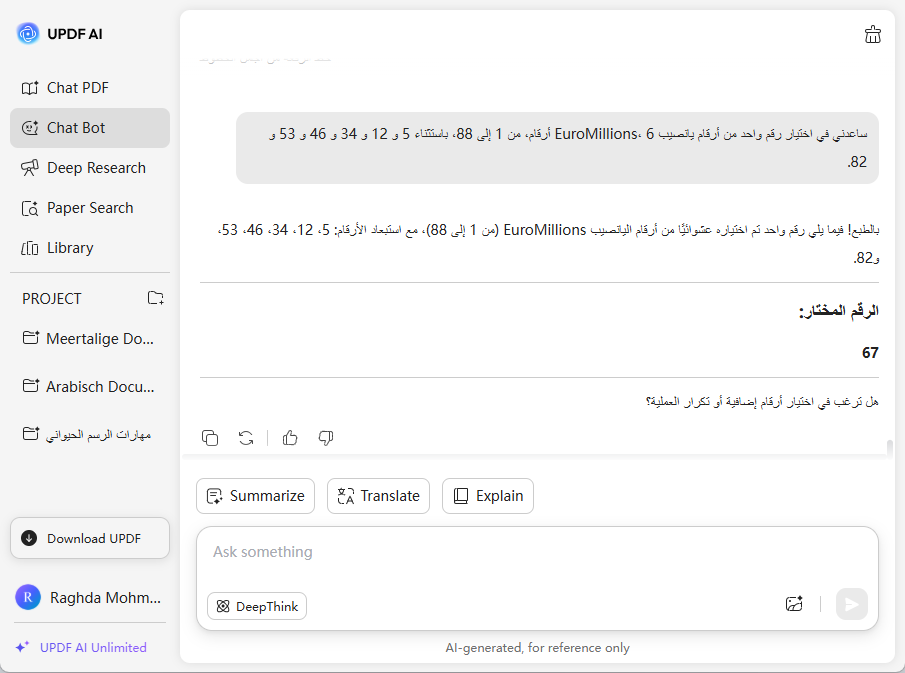يتيح لك UPDF AI تجربة ميزاته مجانًا مع 100 طلب. لا يلزم التسجيل لهذه الاستخدامات الـ100 الأولى، مما يسمح لك بتوليد أرقام اليانصيب واستكشاف أدوات PDF المدعومة بالذكاء الاصطناعي بسهولة وبدون أي التزام.