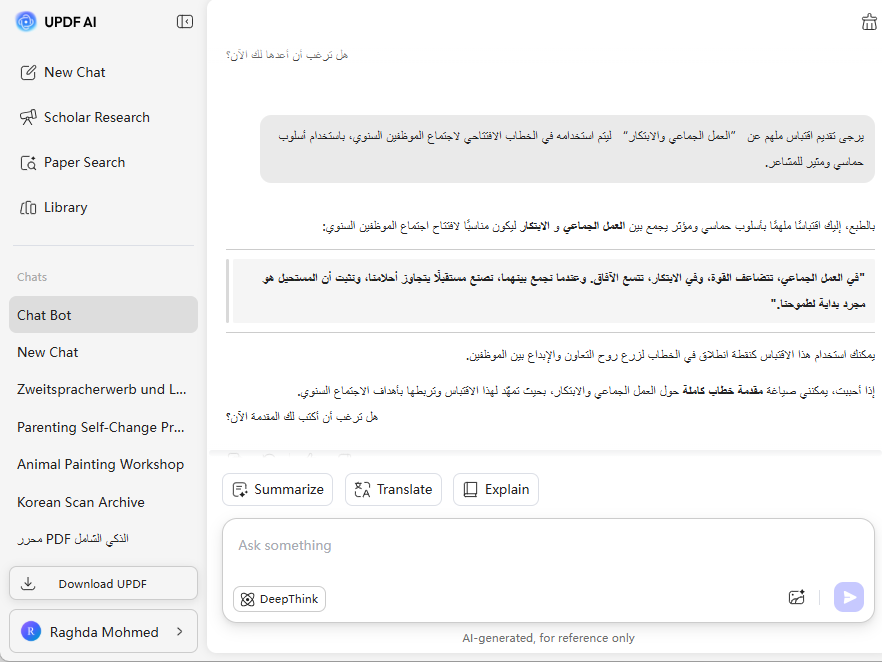 سيقدم الذكاء الاصطناعي نتائجك بسرعة. إذا لم تكن راضياً، يمكنك تعديل طلبك وإعادة التوليد عدة مرات حتى تصل إلى أفضل اقتباس مولّد الاقتباسات من UPDF AI. انسخ الاقتباس النهائي والصقه للاستخدام الفوري.