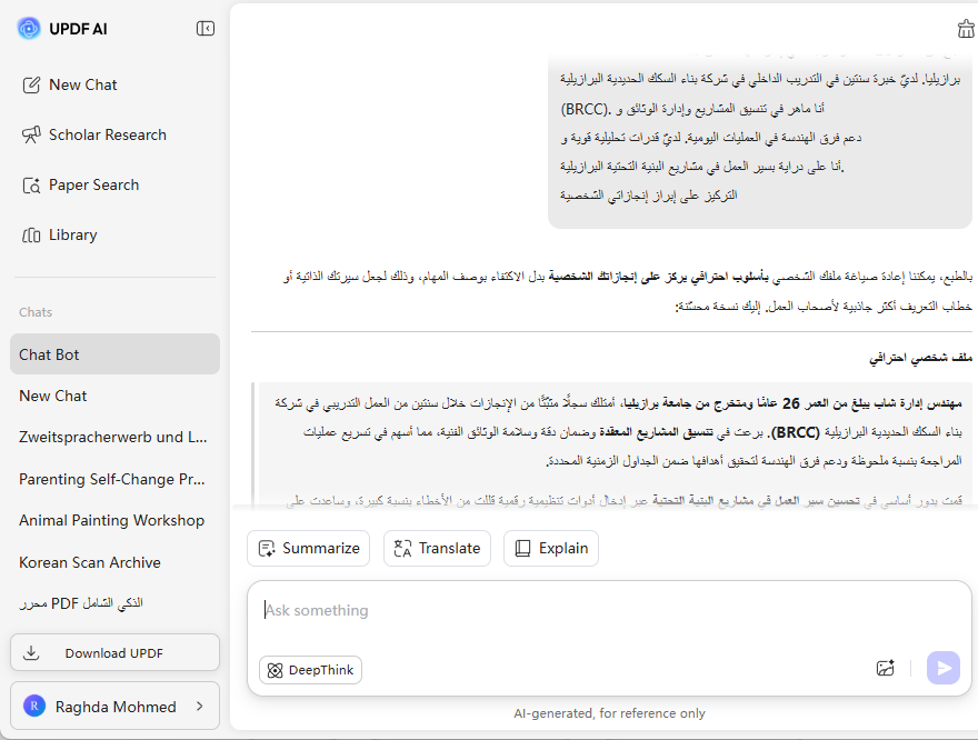 يدعم UPDF AI أكثر من 100 لغة، بما في ذلك الإنجليزية والإسبانية والبرتغالية والفرنسية، مما يضمن أن تكون سيرتك الذاتية جاهزة للفرص في مختلف الدول والمناطق. أينما تقدّمت بطلب، يمكنك عرض ملفك المهني بثقة أمام جمهور عالمي.