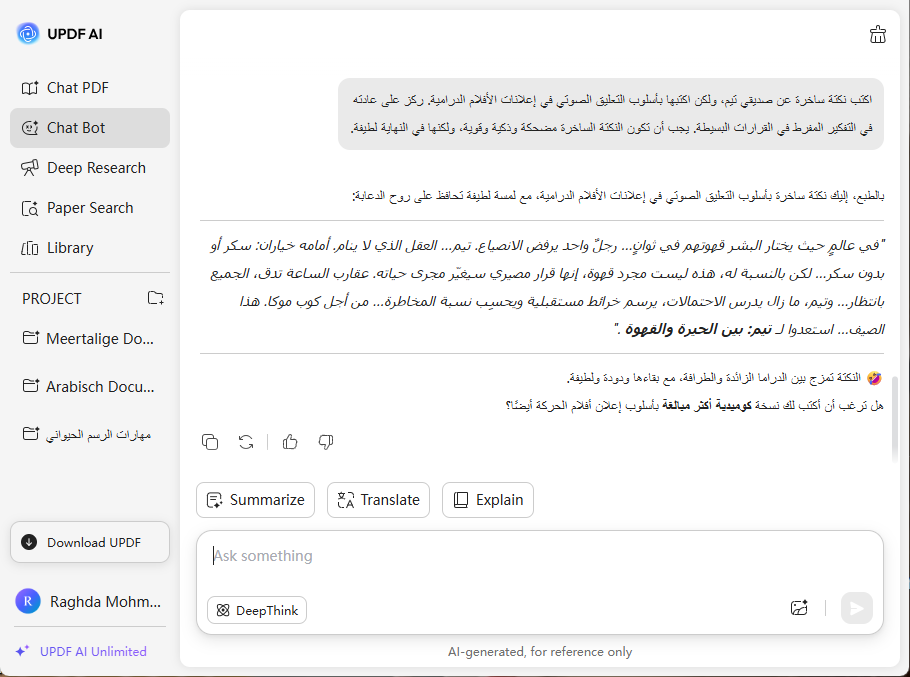 هل تريدها طريفة، ساخرة، مليئة بالميمز، أم عشوائية تمامًا؟ فقط أخبر UPDF AI بنمطك المفضل، وسيتكيف فورًا — سواء كنت تحتاج إلى تعليق ساخر قصير لمجموعة الدردشة أو سخرية كاملة بأسلوب ميم وكأنها قادمة من تيك توك. فكّر به كأنه طاهٍ كوميدي شخصي: أنت تختار النكهة، وهو يقدّم السخرية ساخنة وجاهزة لتناسب جمهورك.