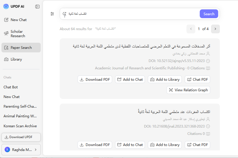 اكتب الموضوع أو الكلمة المفتاحية التي تريد البحث عنها في مربع النص، مثل “اكتساب اللغة الثانية”، ثم اضغط Enter. سيقوم UPDF AI بإجراء بحث سريع ضمن عالم الذكاء الاصطناعي ويعرض لك عددًا كبيرًا من النتائج خلال ثوانٍ قليلة.