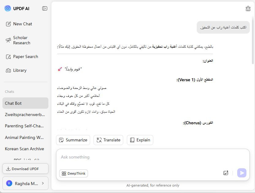 أنشئ كلمات أغنية تتماشى مع أسلوب المقطوعة أو حالتها المزاجية أو لحنها لدعم تطوير إبداعي أسرع. سواء كنت تعمل على نماذج أولية، أو تصقل أفكارًا مبدئية، أو تجرّب اتجاهات جديدة، يوفّر UPDF AI خيارات لغوية مصقولة تعزّز سير عملك الإنتاجي.