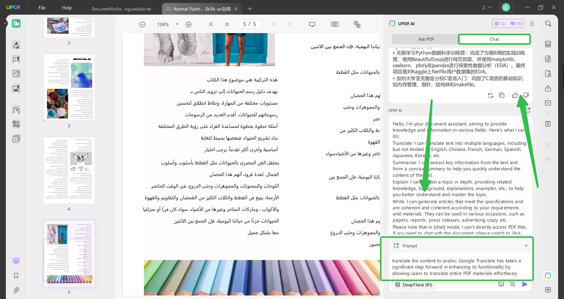 لا داعي للقلق، فهناك أداة بديلة قوية - UPDF يمكنها حل كل هذه المشاكل. مع ميزة الذكاء الاصطناعي الجديدة، UPDF AI، يمكنك ترجمة ملفات PDF الممسوحة ضوئيًا، وترجمة الصور، وترجمة ملفات PDF بالكامل، وترجمة حسب الصفحات، وأكثر من ذلك. كما أنها متكاملة مع ChatGPT لتقديم نتائج ترجمة دقيقة.