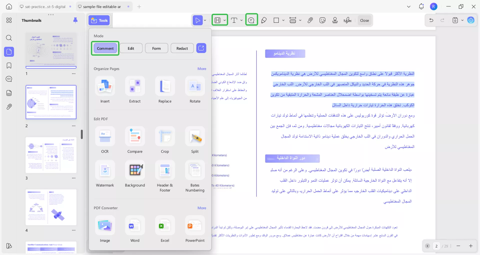 بعد الاستيراد، اضغط على خيار الأدوات (Tools) ثم اختر التعليقات (Comment) للدخول إلى واجهة التعليقات. بعد ذلك، استخدم أيقونة تمييز النص (Highlight) وحدد النص لتسليط الضوء على المعلومات المهمة. بعد الانتهاء، اضغط على خيار الملاحظات اللاصقة (Sticky Notes) لإنشاء ملاحظة تحتوي على محتوى محدد.
