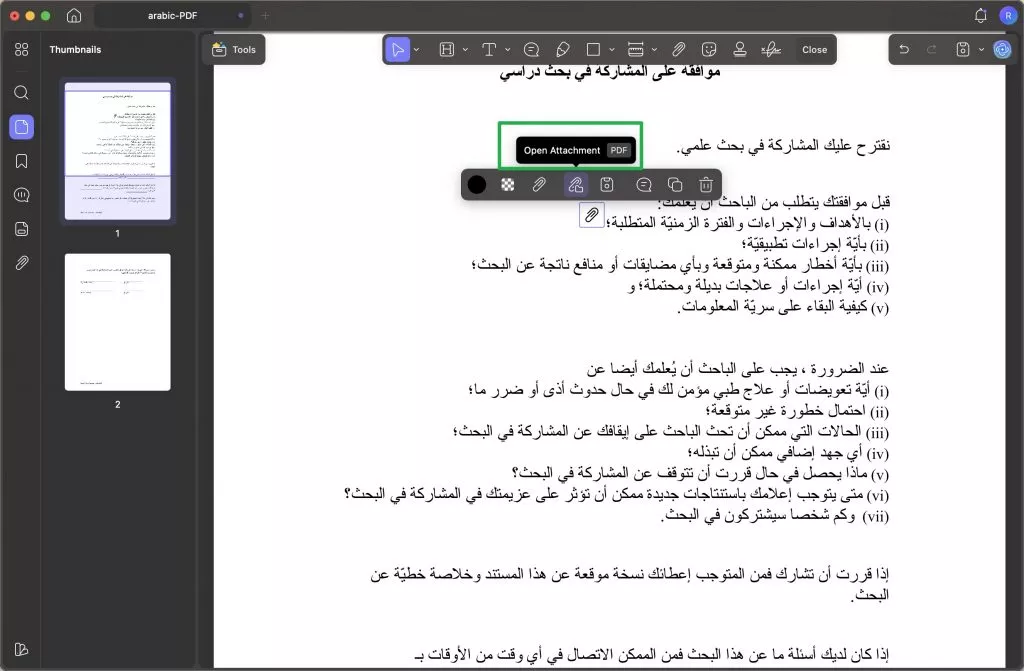 انقر على المكان داخل المستند حيث تريد إضافة رابط للمرفق، ثم اختر الملف الذي ترغب في إرفاقه بملف PDF.
