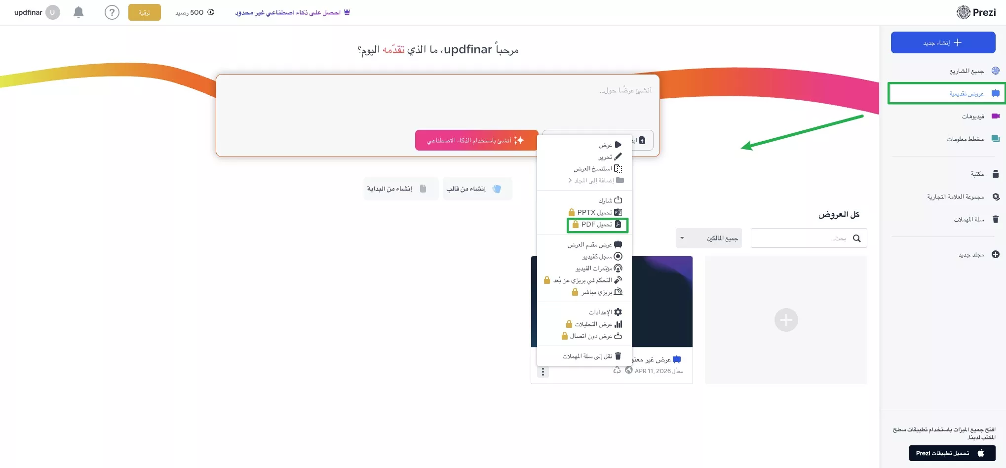 فيما يلي خطوات تنزيل عرض Prezi بصيغة PDF.