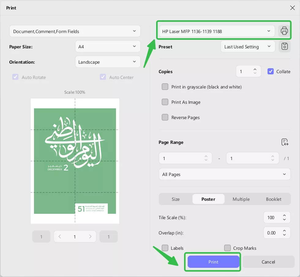 بعد ذلك، في نافذة الطباعة، قم بتحديد حجم الورق، واتجاه الصفحة، ونطاق الصفحات، ثم انتقل إلى تبويب الملصق (Poster). بعد ذلك، عدّل مقياس التقسيم (Tile Scale 100%) لتكبير أو تصغير الملصق، واضبط خيار التداخل (Overlap) إذا كنت ترغب في إضافة هوامش لقص الصفحات ومحاذاتها بسهولة.