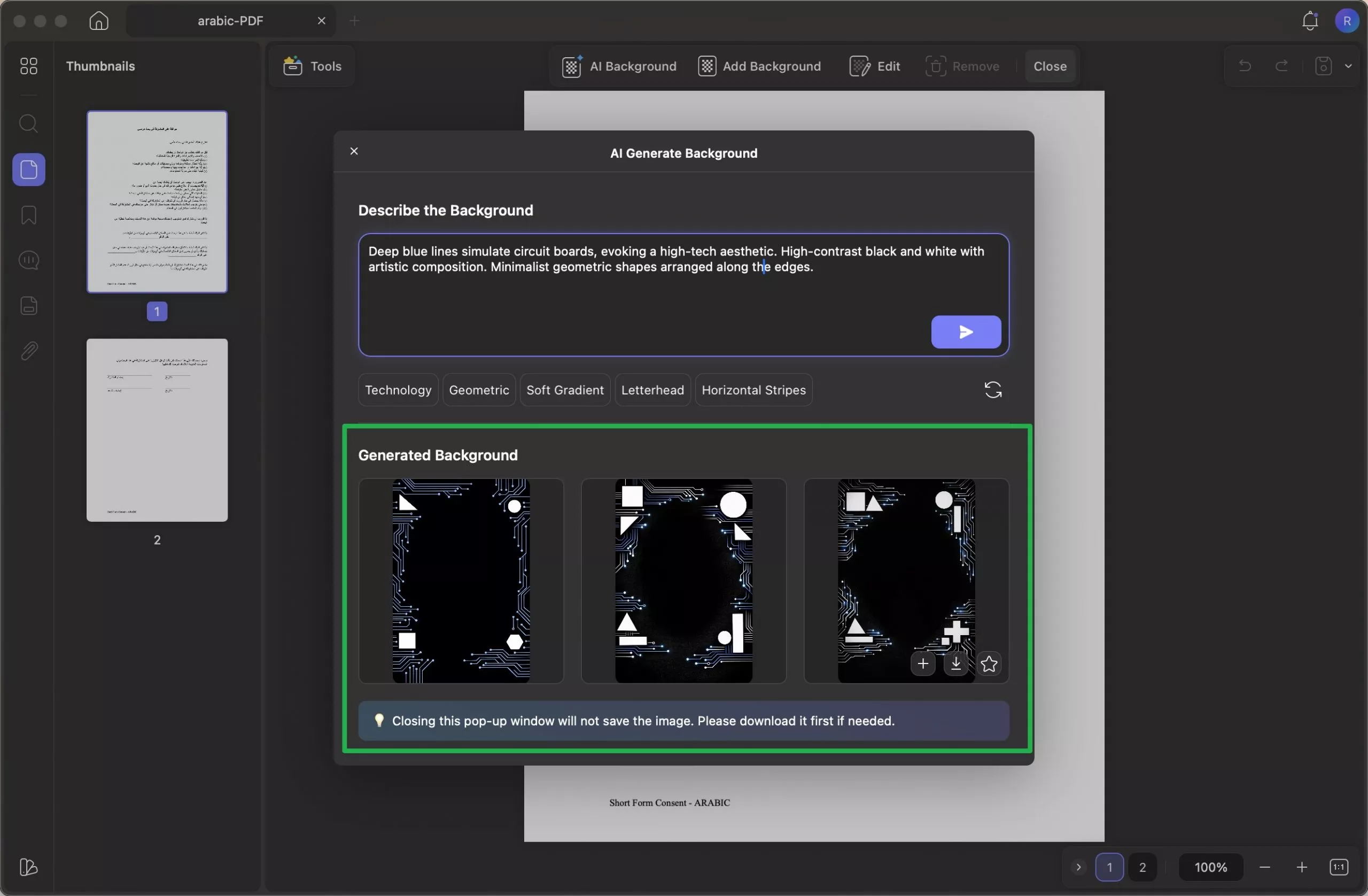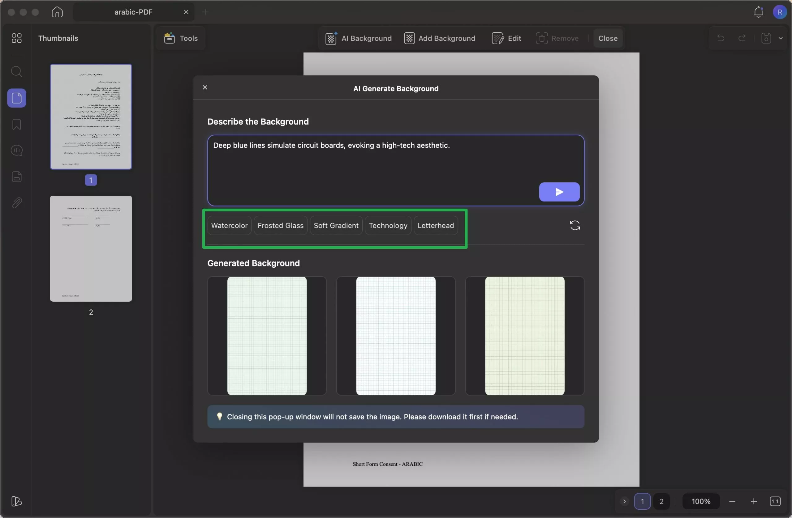 يتيح لك UPDF إدارة الخلفيات التي تم إنشاؤها بالذكاء الاصطناعي وإعادة استخدامها بسهولة. يمكنك حفظ الخلفيات داخل UPDF أو تنزيلها إلى جهازك. كما يمكنك إضافتها مباشرة إلى المستند وتخصيص مظهرها.