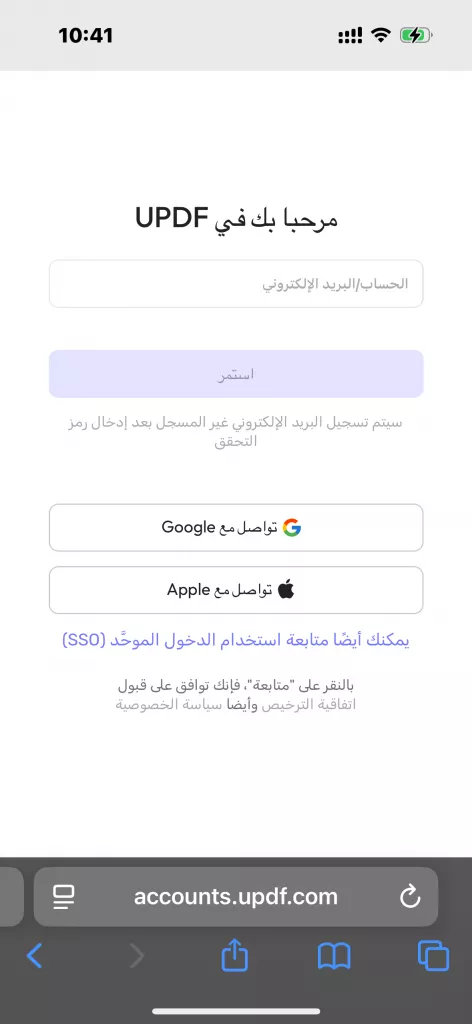 - بعد ذلك، أدخل بريدك الإلكتروني أو حسابك واضغط على "Continue(متابعة)" لبدء استخدام UPDF. يمكنك أيضًا تسجيل الدخول باستخدام حساب Apple أو Google.