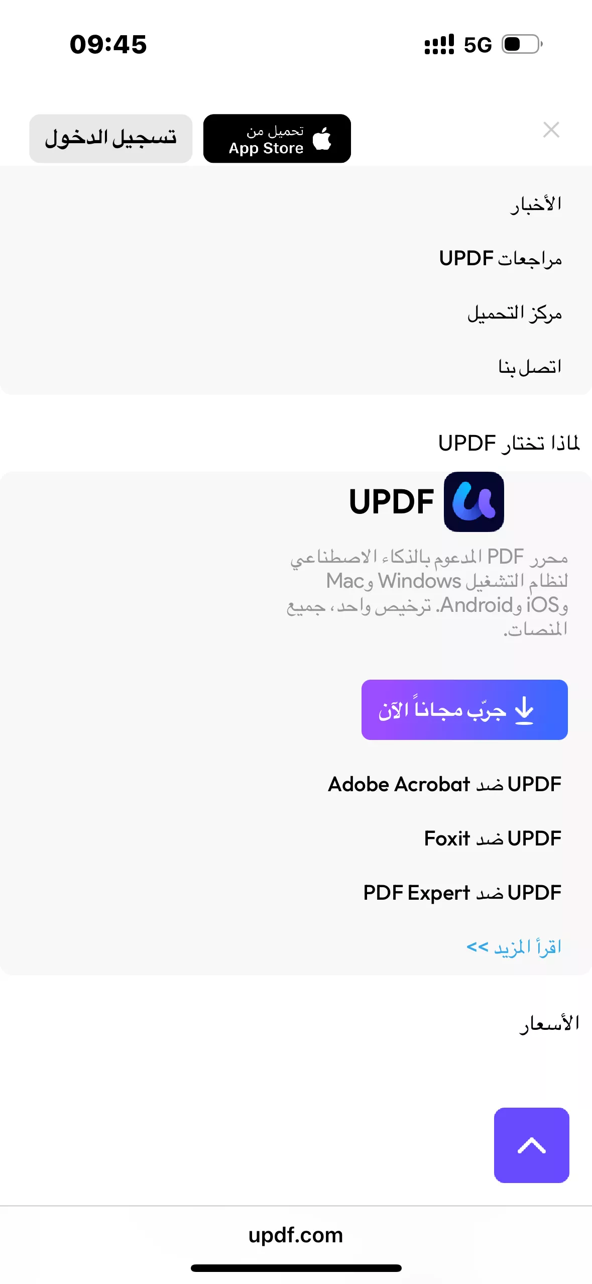 - الخطوة 1: قم بزيارة الموقع الرسمي لـ UPDF، ثم مرّر إلى الأسفل واضغط على زر "الأسعار" لاختيار خطة التسعير التي تناسبك. بدلاً من ذلك، يمكنك الانتقال مباشرةً إلى صفحة التسعير.