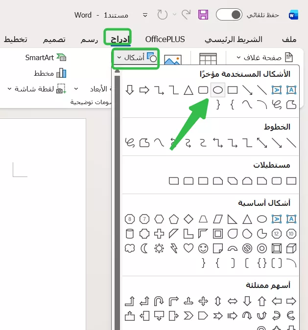 - اختر شكل «البيضاوي» (Oval)، حيث لا يوفر Word شكلاً مخصصًا للدائرة بشكل مباشر.