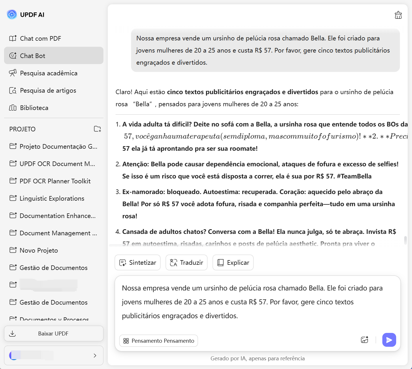 Eles precisam de uma grande quantidade de textos publicitários para páginas de produtos, anúncios em redes sociais, roteiros de vídeos curtos ou campanhas promocionais. O gerador da UPDF AI os ajuda a criar pontos de venda criativos e atraentes em segundos.