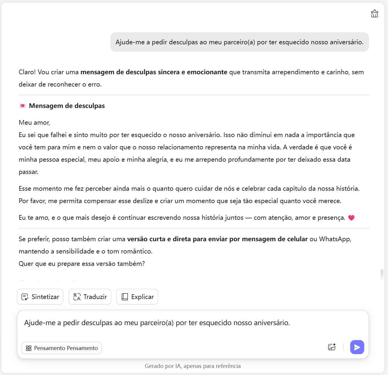 Precisa de um pedido de desculpas carinhoso para seu parceiro? Um e-mail formal para seu gerente? Ou um “foi mal” leve para seu melhor amigo? Basta escolher a dinâmica do relacionamento e o tom desejado. O gerador se adapta instantaneamente — como ter um coach pessoal de comunicação para qualquer situação.