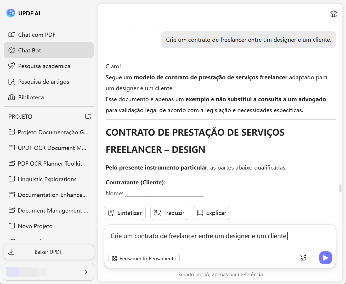 Crie contratos nos quais você pode confiar. O UPDF AI garante acordos precisos, refinados e prontos para uso, ideais para freelancers, pequenas empresas e equipes de RH.