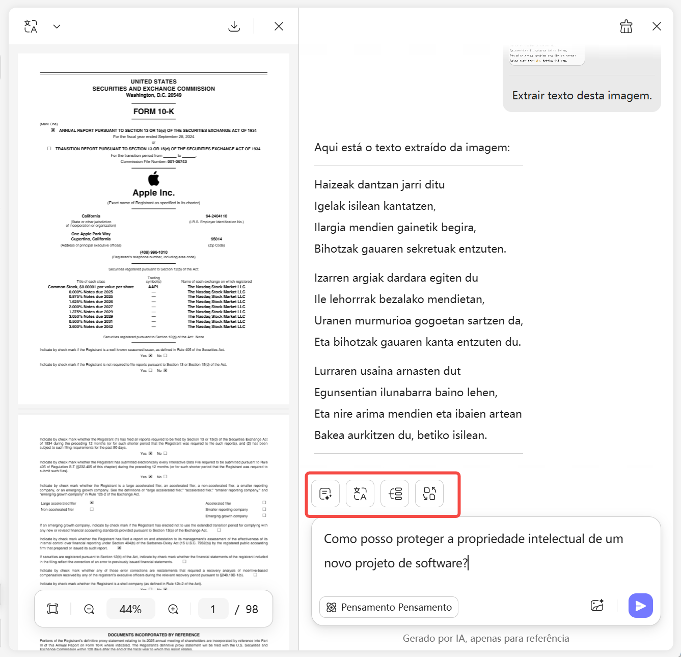 Quando precisar revisar, resumir ou traduzir rapidamente documentos jurídicos, basta enviar seu arquivo e clicar nas opções “Resumir” ou “Traduzir PDF” para obter resultados instantâneos.