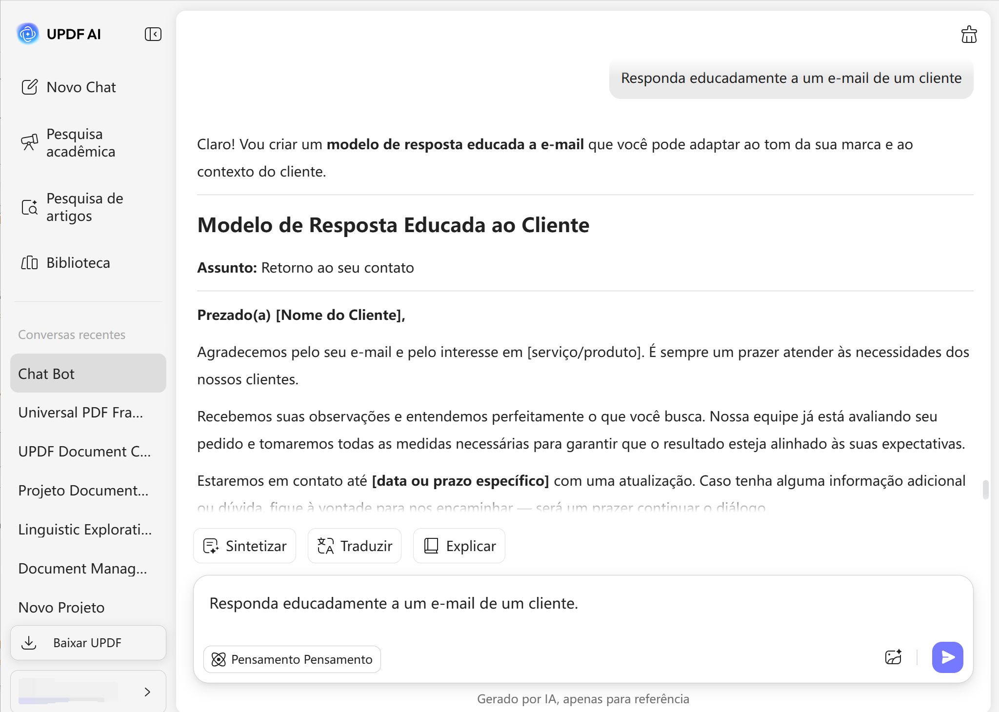 Passo 3: Clique em Enviar e deixe o UPDF AI gerar uma resposta polida e profissional que pode rever, editar se necessário, e usar para e-mails, redes sociais, relatórios ou qualquer comunicação.