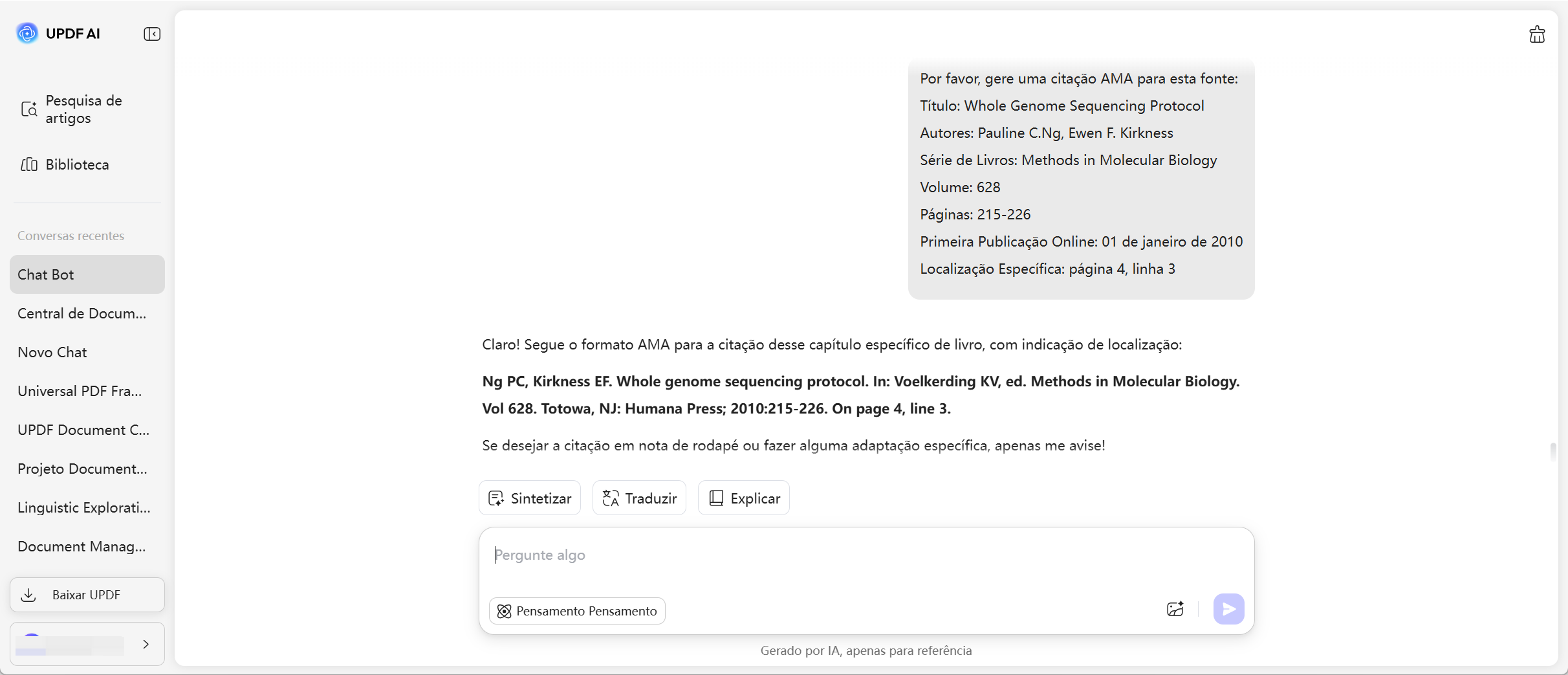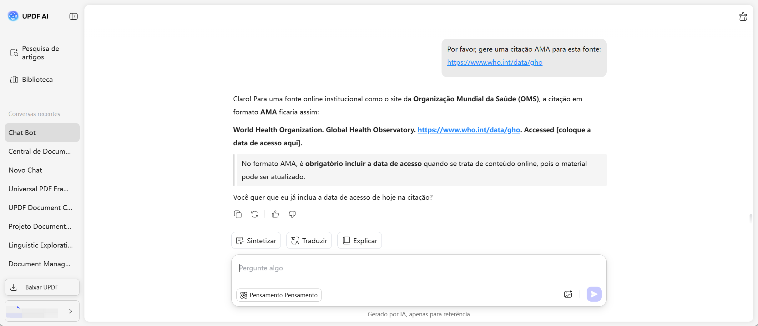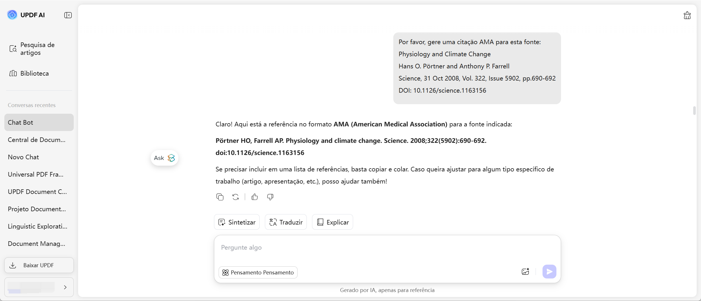 Absolutamente! Com o nosso Gerador de Citações, basta pedir à UPDF AI para gerar uma citação no formato APA, MLA ou Chicago e pressionar Enter. Receberá uma citação precisa em segundos.