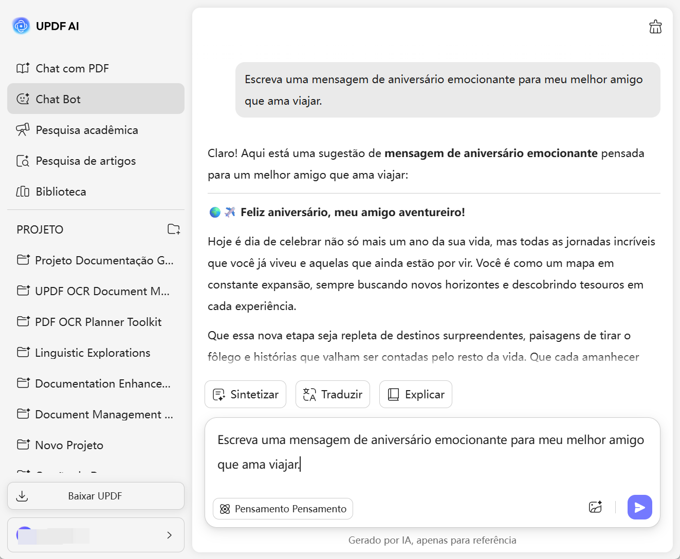 O Gerador de Mensagens de Aniversário com IA do UPDF é simples, rápido e disponível online—não são necessários prompts complicados ou configurações. Você pode criar e editar mensagens instantaneamente em qualquer dispositivo, seja no desktop ou no celular.