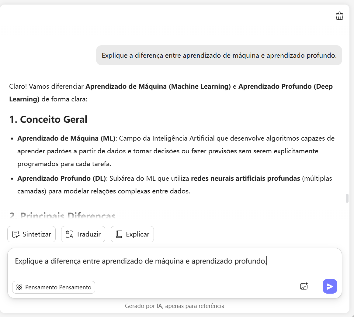 Chat de Texto: Se você deseja apenas um bate-papo rápido baseado em texto, digite sua pergunta ou comando e pressione Enter. Exemplo de pergunta: “Explique a diferença entre aprendizado de máquina e aprendizado profundo.” Para insights mais profundos, clique em DeepThink no canto inferior esquerdo da caixa de chat.