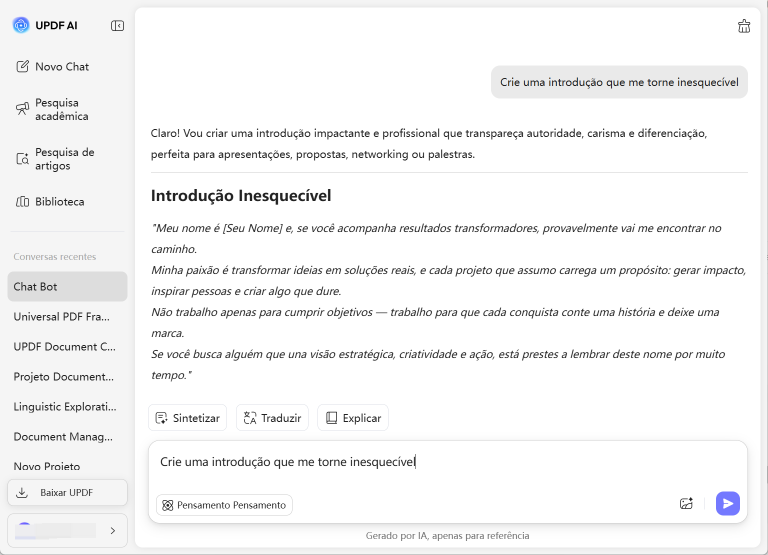 O Gerador de Introduções do UPDF AI não se limita a biografias pessoais. Ele cria introduções envolventes para artigos, relatórios, apresentações, discursos e publicações em redes sociais, adaptando cada introdução ao contexto e ajudando você a captar a atenção do público imediatamente.