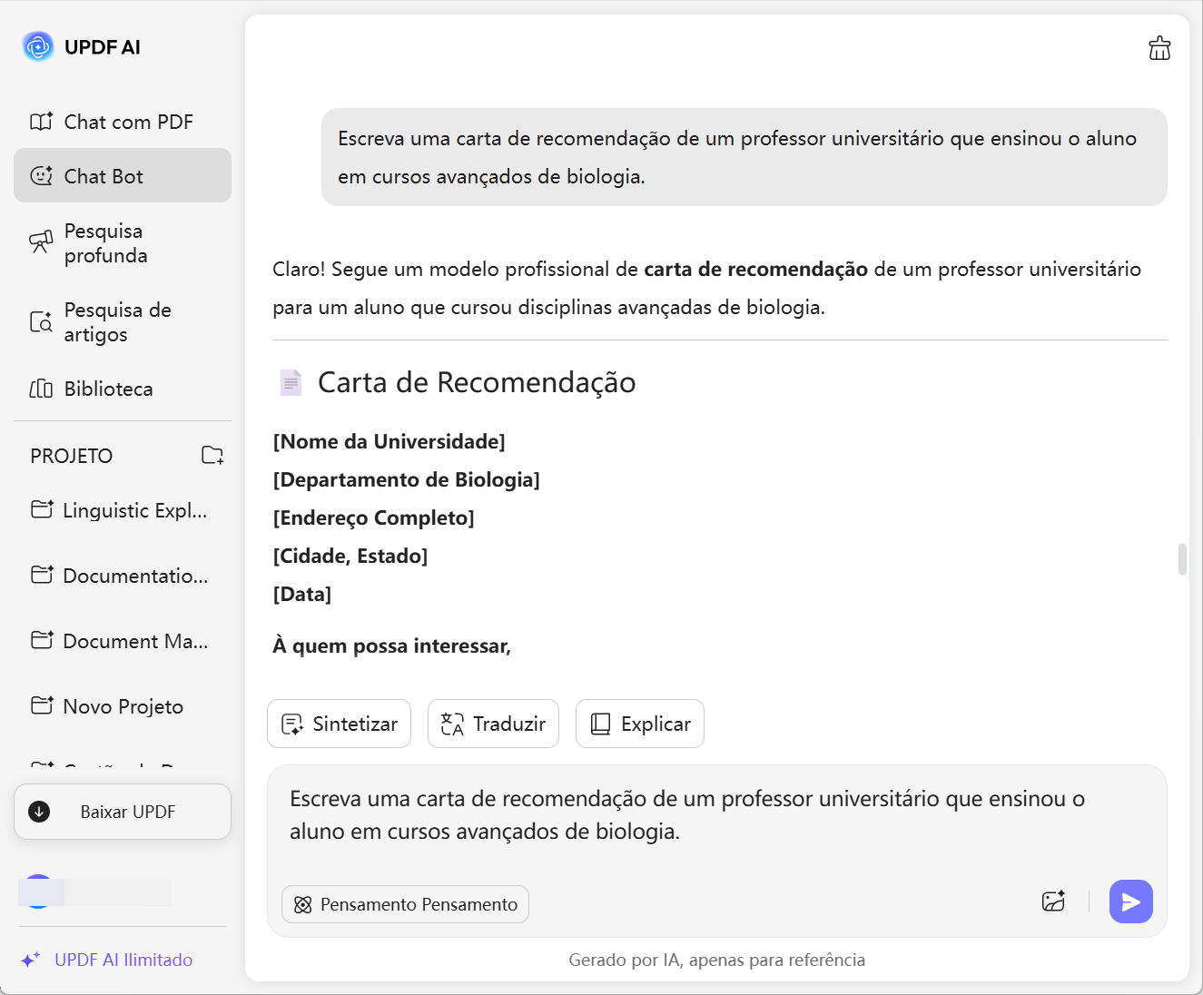 A UPDF AI entende melhor contextos específicos (acadêmico, profissional, bolsas) e ajusta o tom e os exemplos de acordo, ao contrário de IAs genéricas que frequentemente produzem rascunhos padrão para todos os casos.