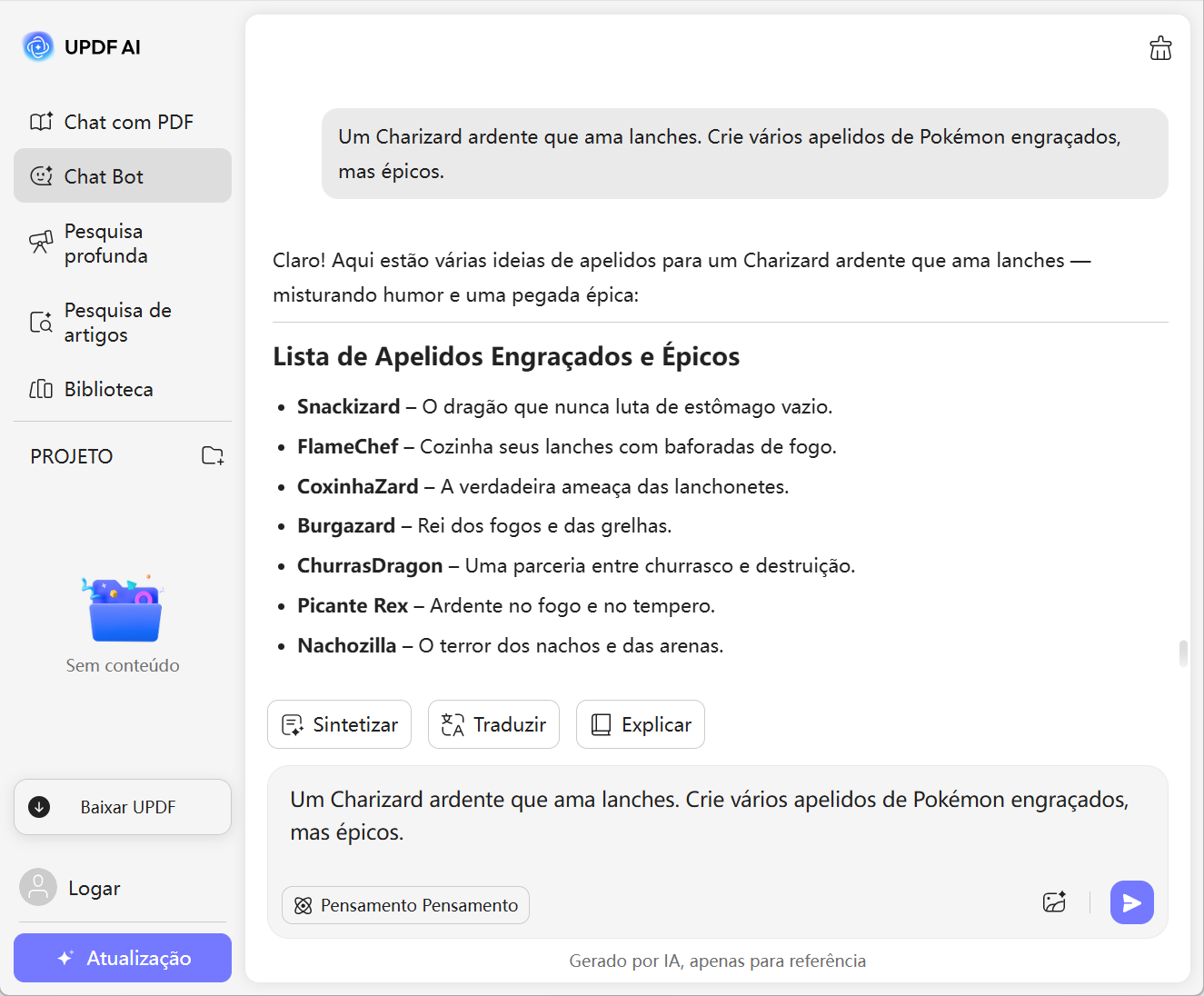 Por que se contentar com “Charizard” quando você pode entrar na batalha com “Lagarto Picante Supremo”? O Gerador de Nomes Pokémon com IA do UPDF traz risadas extras para batalhas casuais, dando à sua equipe apelidos hilários ou épicos gerados pela IA. Metade da diversão é ver seus amigos rirem antes mesmo da luta começar.