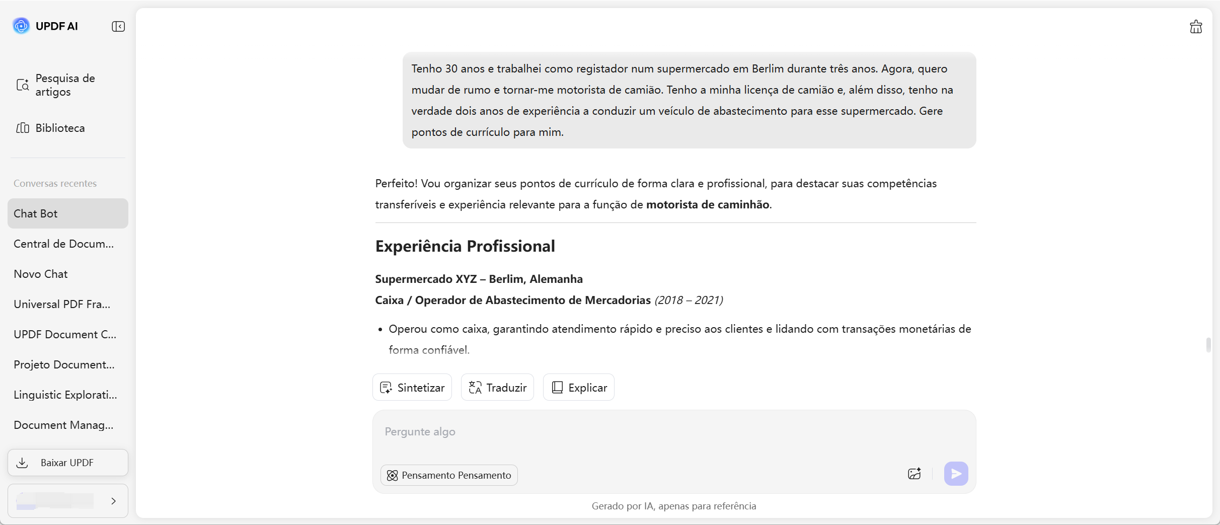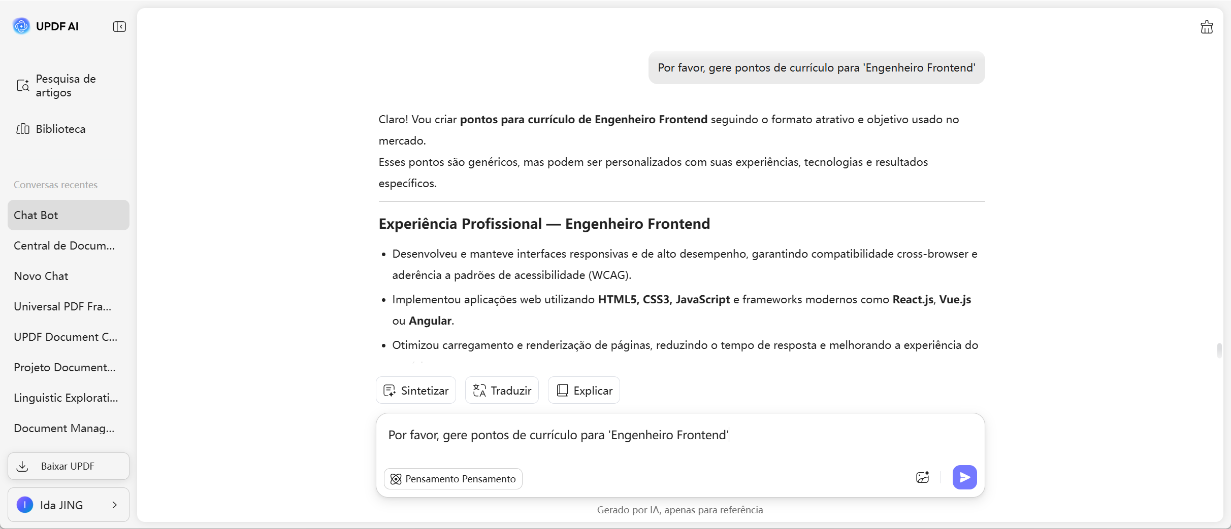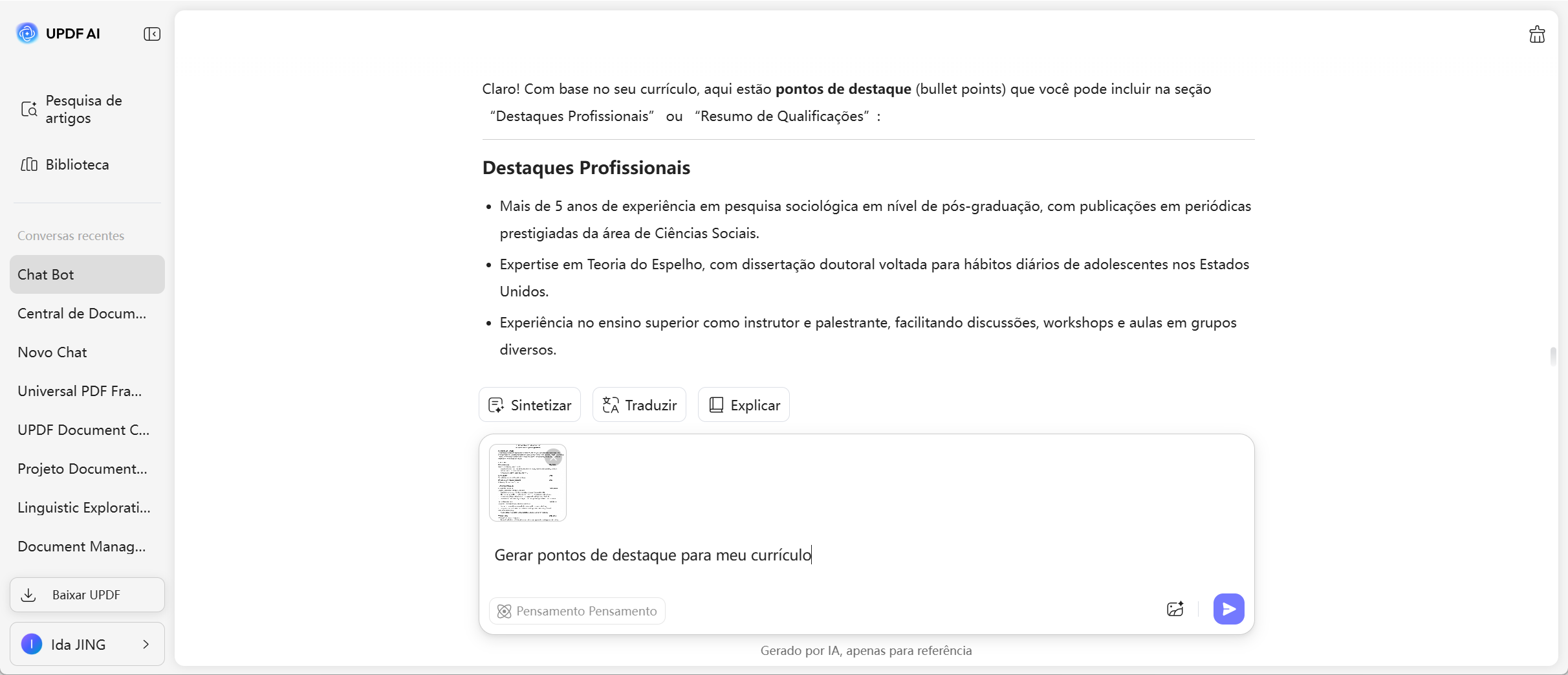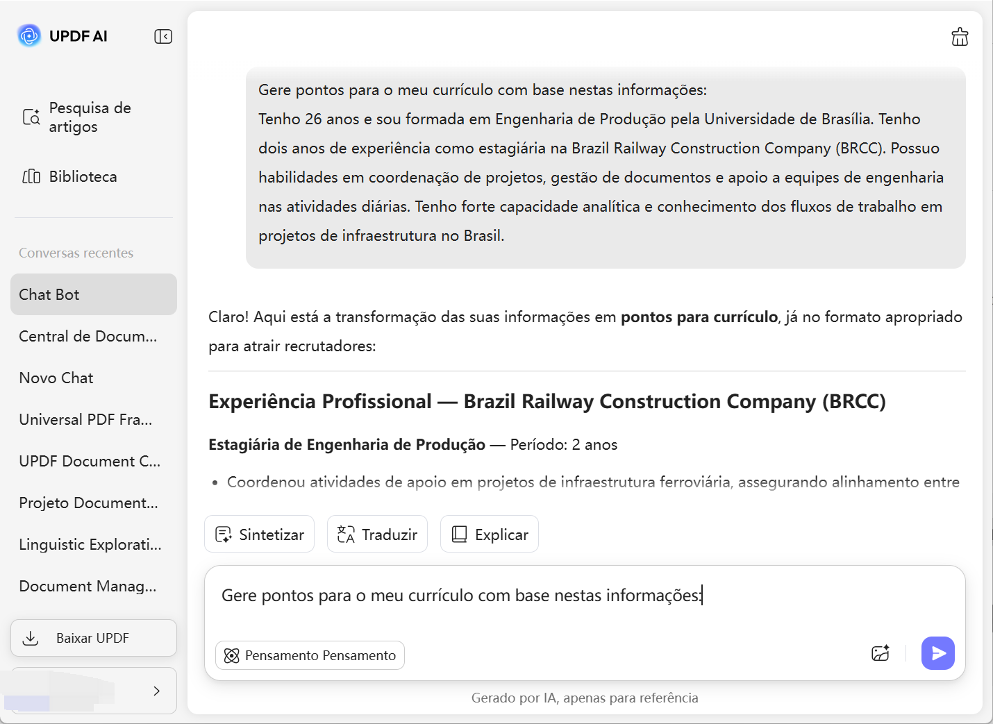 A UPDF AI gera pontos de currículo claros, polidos e impactantes em apenas segundos, reduzindo significativamente o tempo gasto a reescrever o seu currículo. Em momentos, terá pontos de currículo concisos e competitivos que destacam os seus pontos fortes sem esforço.