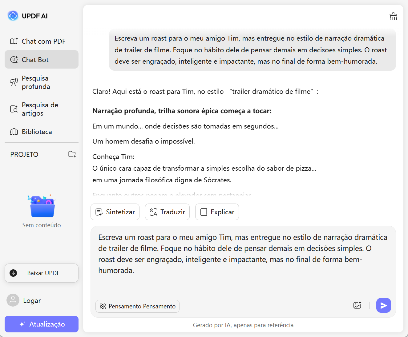 Quer algo engraçado, sarcástico, digno de meme ou simplesmente bobo? Basta informar seu estilo à UPDF AI, e ela se adapta instantaneamente — seja uma frase sarcástica para o grupo de chat ou um roast completo de meme direto do TikTok. Pense nela como seu chef de comédia pessoal: você escolhe o sabor, e ela serve o roast quente e pronto, sob medida para seu público.