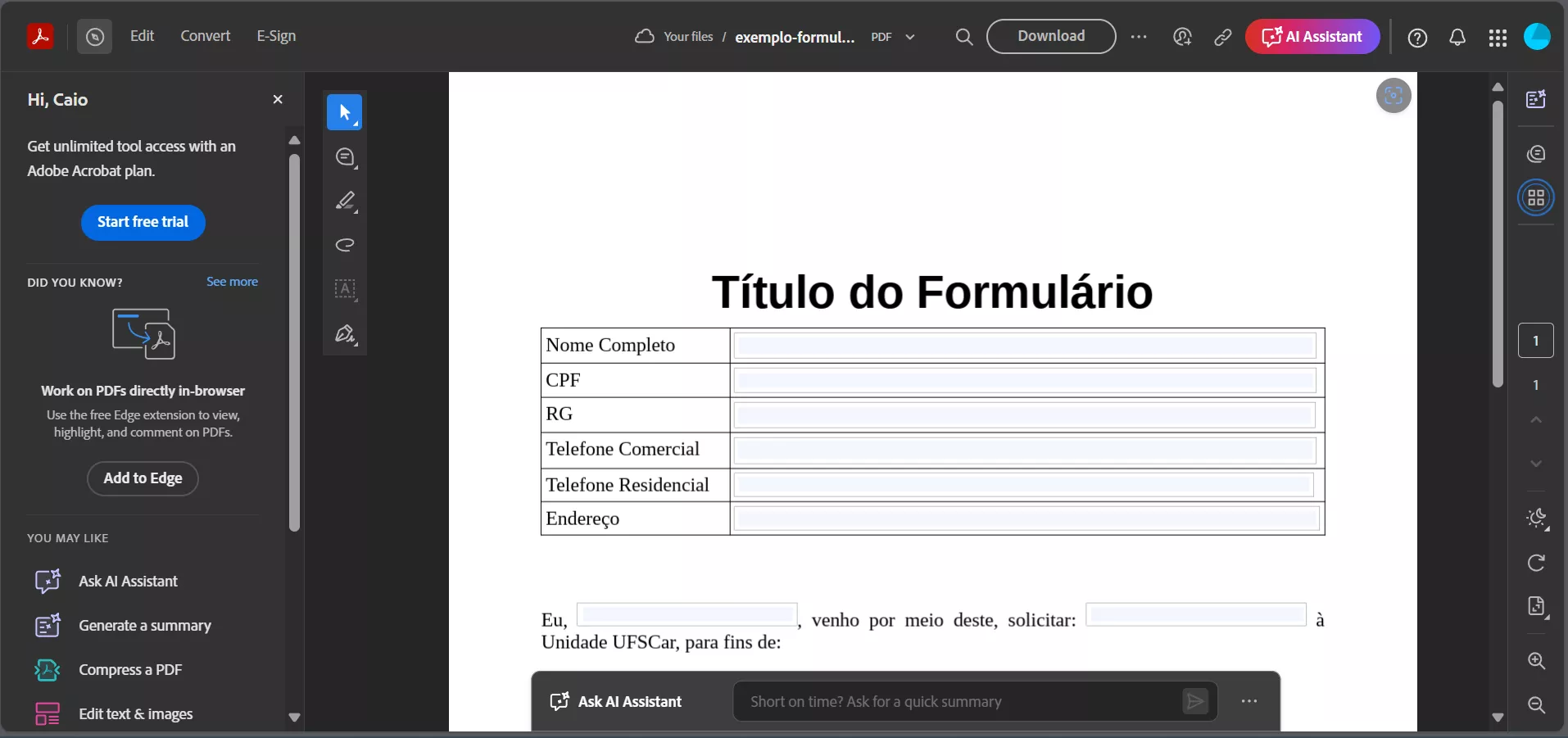 O Adobe Editor de PDF Online não é totalmente gratuito. Ele oferece uma versão limitada sem nenhum custo com acesso a recursos básicos. Para recursos avançados, você precisa de uma assinatura do Adobe Acrobat Pro.