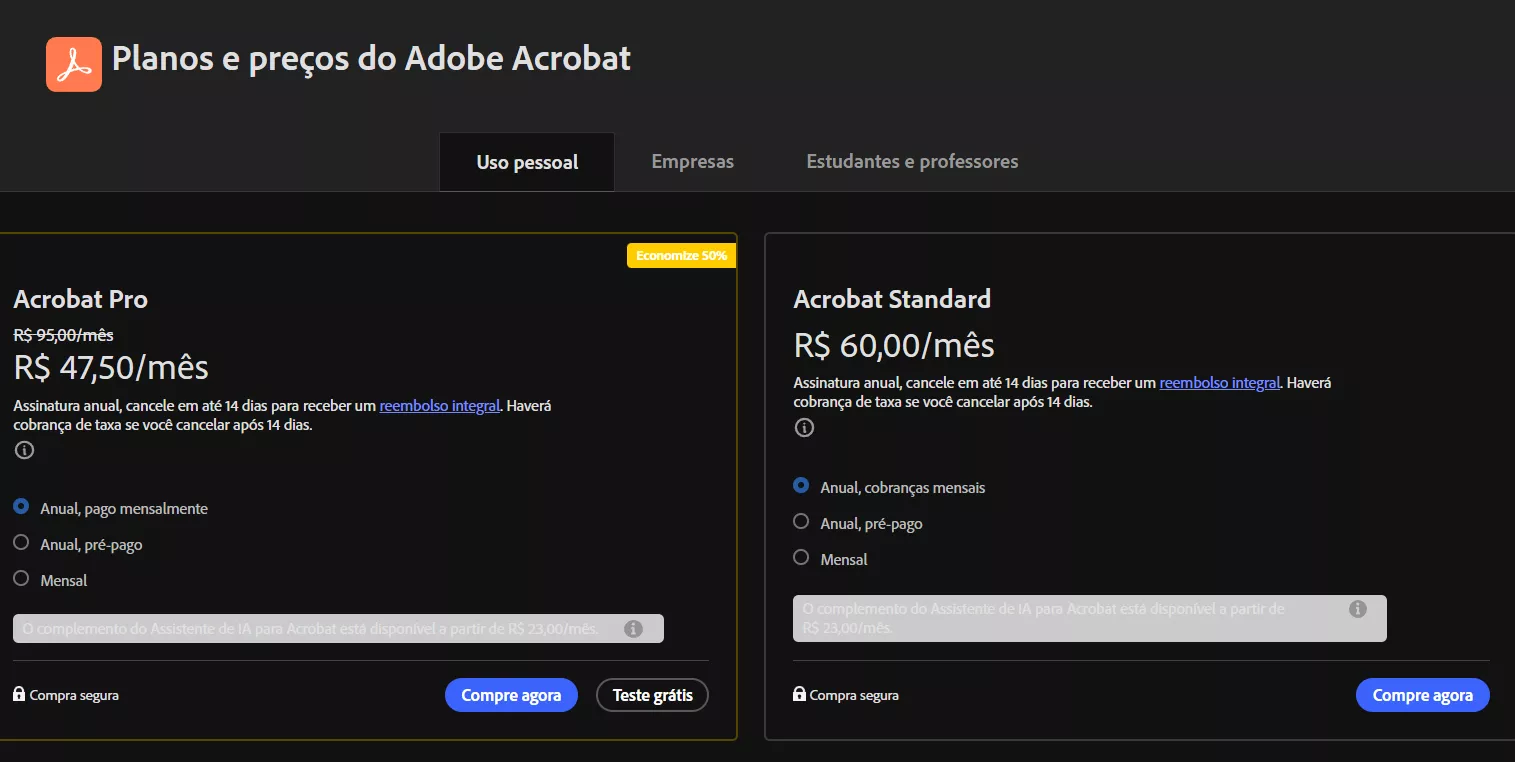 Para recursos avançados, você precisa assinar o plano Acrobat Pro, que começa em R$ 60,00 /mês.