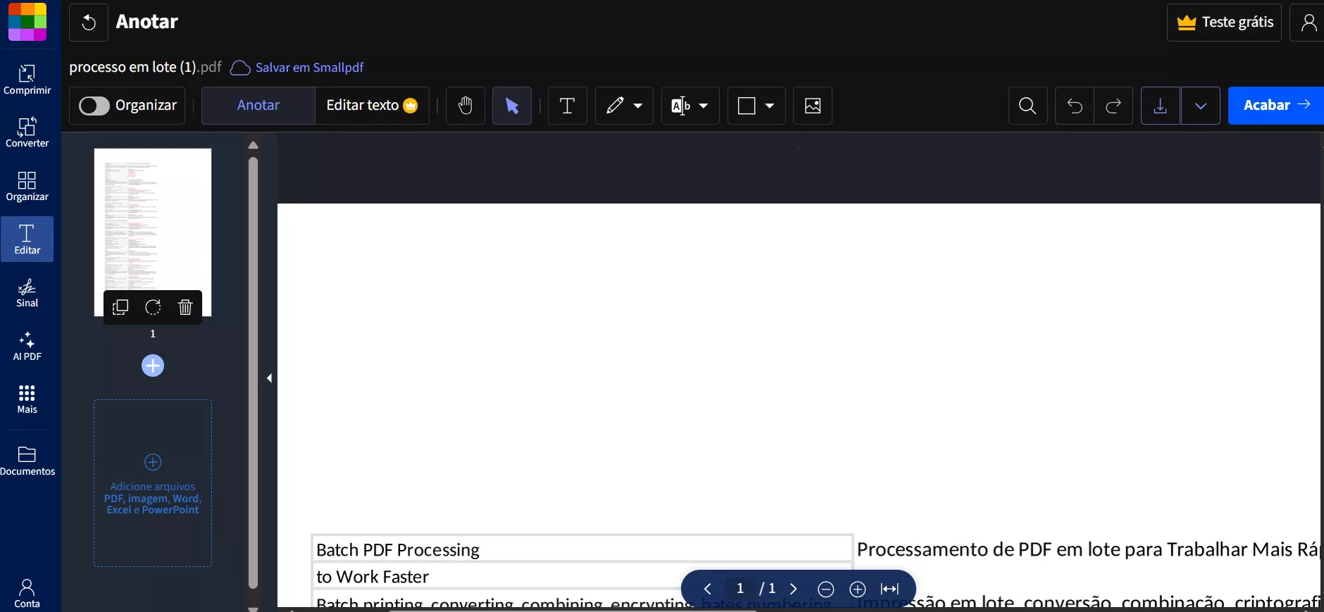 Instruções: Faça upload de um PDF para a plataforma e clique na ferramenta "Adicionar texto" para inserir novo texto. Para editar o texto existente, alterne para o modo de edição e faça as alterações desejadas. Você também pode adicionar novas imagens ao documento.