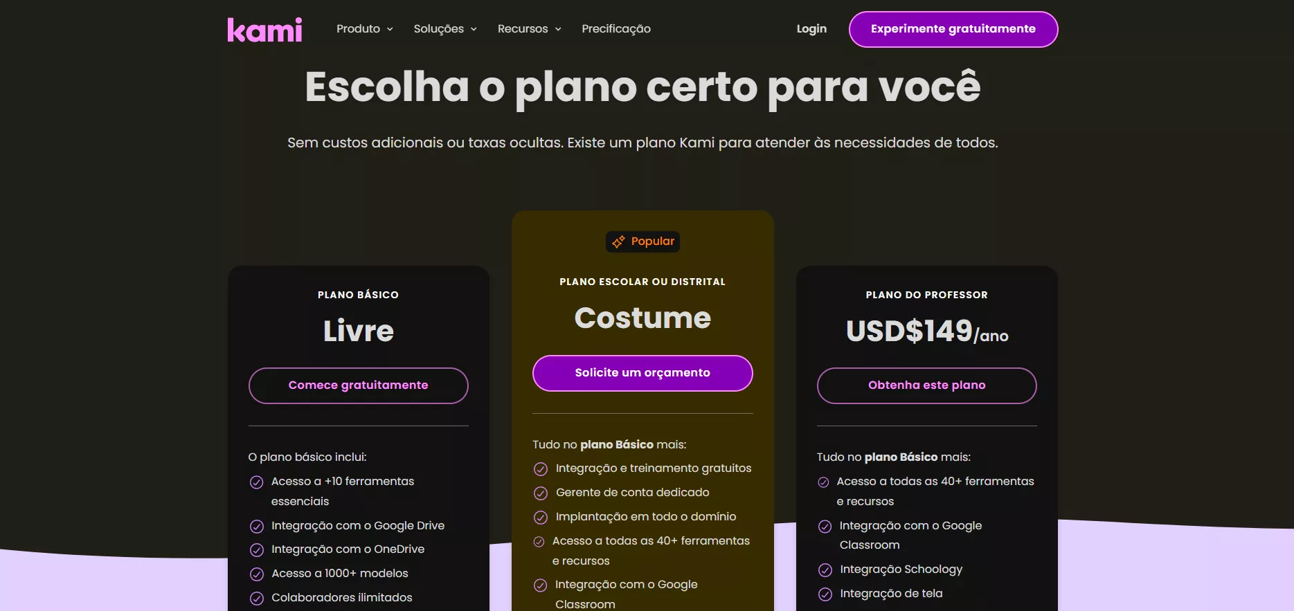 Se você é professor e deseja recursos mais profissionais, precisa atualizar suas permissões. Abaixo estão todos os três planos de preços oferecidos pelo Kami PDF: