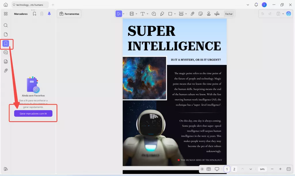 Ao ler um artigo extenso com dezenas de páginas, é natural desejar marcadores claros e fáceis de navegar. Nesse caso, você pode usar a ferramenta Gerar Marcadores com IA para criar marcadores e um sumário, além de usar a IA para resumir o conteúdo correspondente a cada marcador.