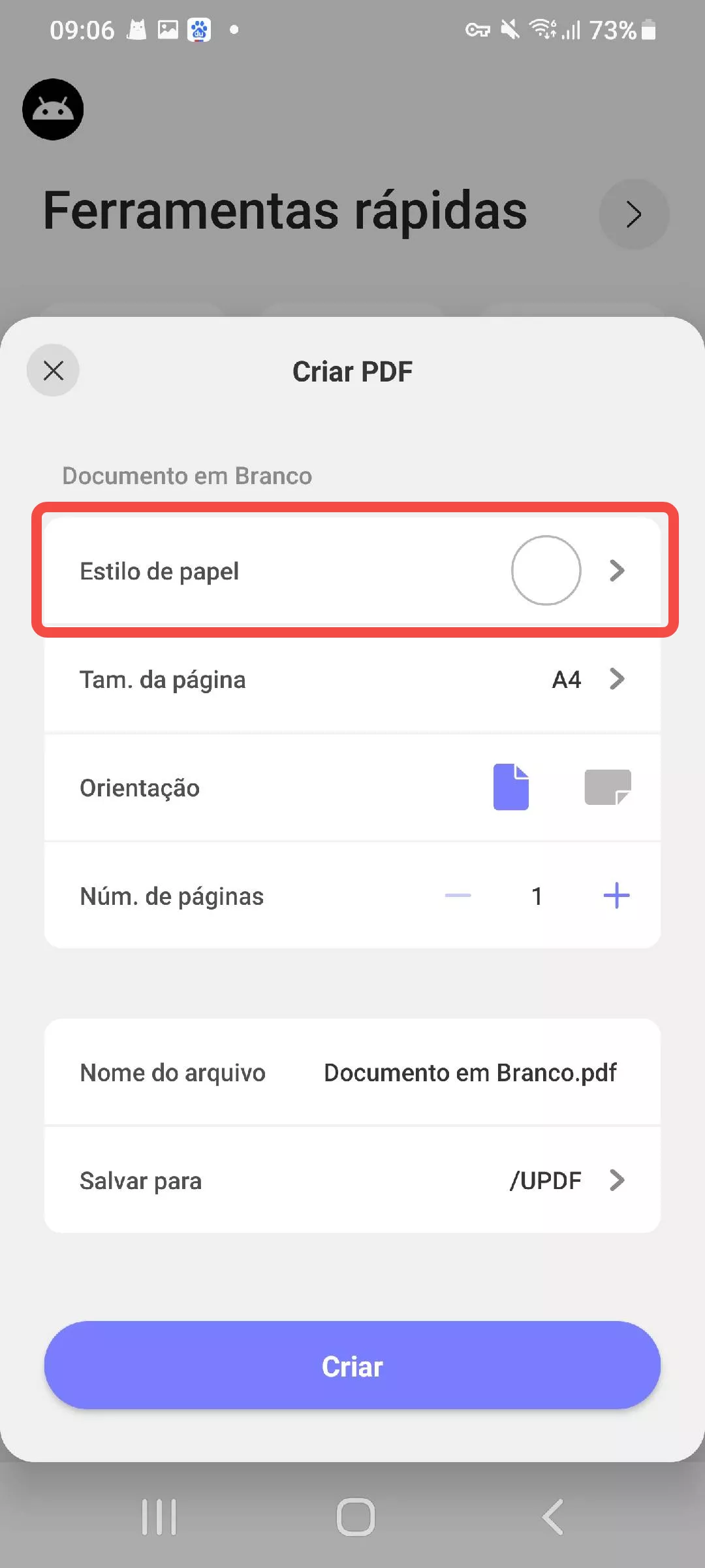 O UPDF para Android permite que você crie um PDF em branco do zero com opções completas de personalização. Você pode ajustar o layout da página, o tamanho, o número de páginas e muito mais.
